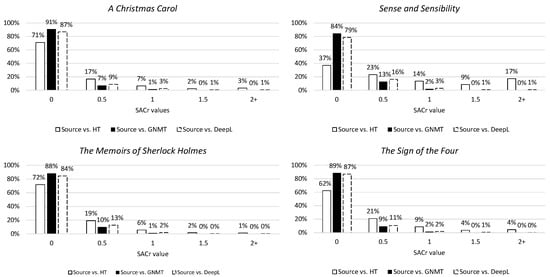 The first metric is word_cross, which concerns the reordering of words by measuring crossing links. As can be seen in Figure 10, the NMTs tend to make no or fairly small deviations from the source word order (0 and 0.5) and scarcely make any large changes (1+). The tendency for making large changes to word order lies more with the human translation, although this also seems capable of copying or more or less following source word order. This observation can also be recognized when looking at the second metric for syntactic divergence, namely SACr (Figure 11). This metric describes the reordering of linguistically motivated word groups by measuring crossing links and shows the same tendencies indicated by the word_cross values.