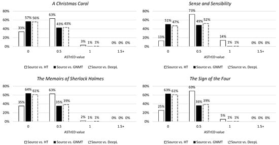 The last metric of syntactic divergence is ASTrED, a metric used to illustrate reordering on a deeper (linguistic) level by employing edit distance between dependency trees. The results of this metric are similar to the results of the previously mentioned metrics (Figure 12). Although the scores cannot be equated across the three metrics, the tendency of the NMTs to remain close to the structure of the ST (while the HT may deviate more from the ST) can be observed throughout.