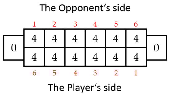 The two players sitting at each side of the board control their own pits and the store (kalaha) on their right-hand side. Let the player having the south side be simply called “the player”, whereas the second one sitting at the north side be called “the opponent” hereinafter, see Figure 3 for the starting position. In each turn of the game, both the players alternate; however, repeated moves are possible (see below). A turn from the player’s perspective is made as follows [,,,,]: