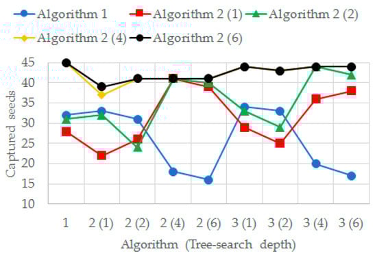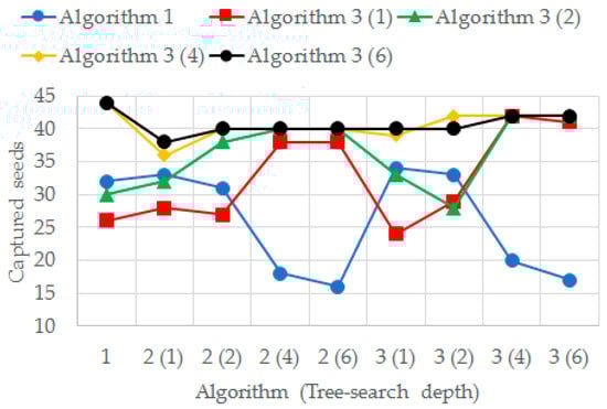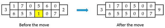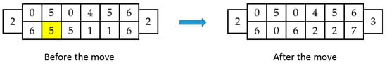 Regarding H1 and H2, the left-most pit (number 6) is the best option to collect (hoard) seeds []. Heuristic H3 looks one move ahead to maximize the diversity of possible moves. Attacking heuristics H4 and H5 look one move forward, and they attempt to maximize the score (i.e., the number of stored seeds). Especially, empty pits on the right-hand side may lead to the possibility of repeated moves within the player’s round [,], i.e., to achieve T4. For instance, even a simple scheme with 6–5–4–3–2–1 seeds in pits (from the left) may lead to 17 repeated moves (i.e., 17 seeds stored in the kalaha within a single round) while four seeds eventually remain in the player’s pits. The chain of such moves starts with emptying the following pits (numbers): 1, 2, 1, 3, etc. Generally, it is desirable to reach a descending amount of seeds inside the pits starting from 6 in pit number 6, while some others on the right-hand side of the board may be empty. Or, a proper choice is to get an ascending number of seeds starting from 1 in the rightmost pit. In some cases, it is possible to clear all the pits at the player’s side within a single round, which yields the end of the game. It was shown that the longest possible chain of such moves for the 6-hole board is 17 [,]. The initial scheme is 6–4–2–3–1–1 followed by the moves: 1, 3, 1, 2, etc. Note that heuristic H6 represents a defensive strategy looking two moves ahead.