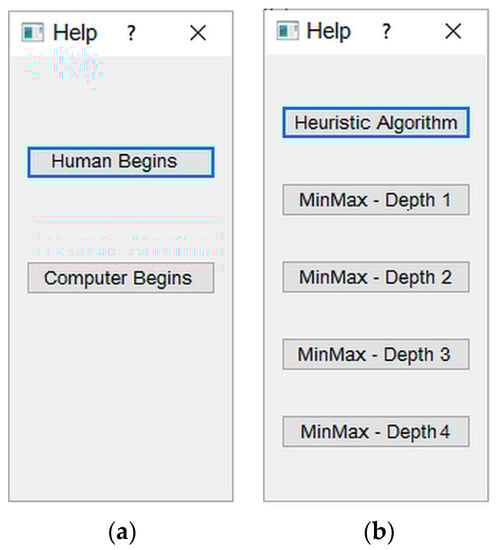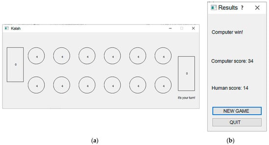 Tree-search algorithms have become popular in the reign of board games. In contrast to brute-force full-game databases, they provide faster searching for a suitable move strategy and usually adopt some artificial intelligence (AI) or heuristic approaches []. Usually, it is supposed that both the players behave optimally—in such a case, the standard mini–max tree-searching algorithm is used to get the evaluation function maximum value for one player and the minimum for the opponent in every single depth of the game tree. In [], an overview of popular and effective enhancements for board game using Monte Carlo tree search (MCTS) agents is given. The MCTS is based on a randomized exploration of the search space []. Ramanujan [] studied, inter alia, the efficiency of a family of mini–max methods, and the Upper Confidence bounds applied to Trees (UCT) [], an advanced sampling-based planning approach, used to general Mancala games. They claimed that both the UCT and mini–max produce players that are competitive with nearly no enhancements to the basic algorithms in Mancala. A combination of the mini–max game-tree search and heuristics was proposed in []. Even if used for a Domineering board when perfect solving (defined as solving without any search), Uiterwijk [,] discussed the advantage of a heuristic that might be very useful in Kalah as well—safe moves. A safe move cannot be prevented by the opponent. In his bachelor’s thesis, Berkman [] summarized and benchmarked several advanced mini–max techniques for Toguz kumalak (a Mancala game close to Kalah), such as alpha–beta pruning, iterative deepening, hash functions, the MCTS, and transpositions tables. An excellent, thorough, and extensive analysis and benchmark of AI game-tree algorithms for several board games (including Kalah) were provided in []. Compared to the preceding referenced source, the greedy algorithm and advanced heuristic mini–max [] (that uses a more refined heuristic function) were applied in addition. The results proved the advantage of the heuristic approach. Perlinski [] proposed a faster search by using the so-called partial board tree search that involves dividing the game board into smaller parts. In [], several Kalah aspects and tactics by Chris Bandy are referred. Note that some of the above-mentioned heuristic approaches are introduced in more detail in Section 3.2.