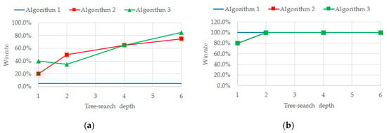 The efficiency of the proposed winning strategies is evaluated by the comparison with the basic and a modified mini–max game-tree-search algorithm [,], with a specific conditioning and evaluation function, of the depths 1, 2, 4, and 6 to get the computer response in a reasonable time. Moreover, a tournament against a medium-experienced amateur human opponent is performed. The obtained results are evaluated by some statistical charts displaying the success rate. These two bunches of experimental results prove a very good performance and real-life applicability of the presented heuristic algorithm.