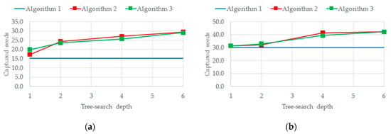 The round-robin tournament in Awari and Oware showed that H6, H5, H1 are the strongest heuristics, while H3 is the weakest one []. Contrariwise, the values of wi indicate the strength of H4, H6, and H5. However, function (3) was set for more Mancala games simultaneously. These results indicate the advantage of the defensive strategy and asymmetric distribution of seeds inside the player’s pits. Rovaris [] played 200 games to benchmark the above-introduced heuristic approach against other algorithms. It was found that the evolved player wins 99.5% against the random player even for the tree-depth of 1, and it always wins for the depth of 8. It plays better than the greedy algorithm, yet the success rate does not depend on the tree-depth much. When playing against the standard mini–max of the depth of 1, the heuristic algorithm of the same depth wins 73.5%. If both the depths equal 4, the success rate is only 61%. Surprisingly, the advantage of the first player was not proved (the first player wins 73%, while as the second one 74%). The depth of 4 is comparable to the MCTS with approx. 4500 iterations. Finally, when playing against itself, the higher depth yields the higher win rate, yet the advantage of playing first is unclear.