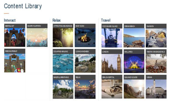 AppliedVR™. This project was completed with the use of a 3-dimensional (3D) VR by AppliedVR™ (Los Angeles, CA, USA). AppliedVR is a VR technology that projects video, graphics and sound using a headset (Figure 1). With implementation of AppliedVR, the user’s visual perception of stimuli from the outside world are blocked. Patients experienced 6 to 30-min VR module(s) that were specifically designed by AppliedVR for relaxation and distraction from anxiety and pain (i.e., beach, guided relaxation, international travel, underwater dolphin experience) (Figure 2). Patients chose the module(s) that they felt would offer them a beneficial experience.