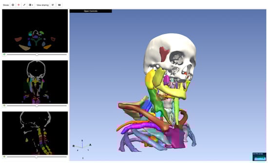 In 2017, Halle et al. [35] published the Open Anatomy Browser within Brigham Women’s Hospital’s Open Anatomy Project intending to democratize medical knowledge and share data for students, doctors, researchers, and the general public. The tool is a web-based atlas viewer showing 3D anatomical models, including image cross-selections of labeled structures and collaborative tools. The browser is created with Google’s Angular web framework, such as AngularUI (https://angular.io/), and incorporates the 3D models with WebGL and Three.js. An example screenshot from the project’s website is illustrated in Figure 1.