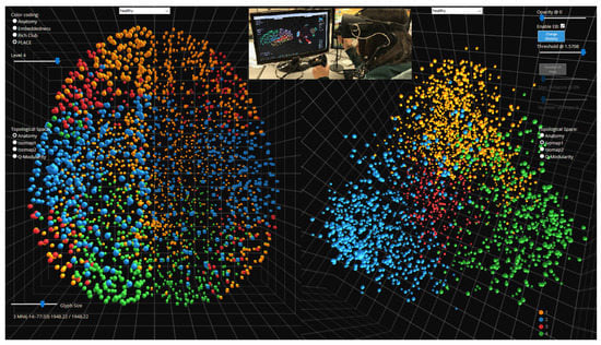 Investigating connectome data from different perspectives in NeuroCave. Left side shows the connectome in the anatomical space and the intrinsic space on the right with color legend right bottom. A neuroscientist is shown in the top of the image exploring the 3D data with a VR headset. Users are allowed to switch between standard and VR modes. Source: [40].