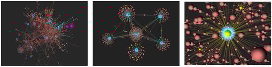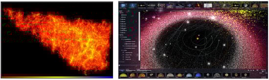 Pomarède et al. [138,139] presented useful web-based visualizations using Sketchfab to study and create maps of the universe or cosmos. Sketchfab (https://sketchfab.com/) is a WebGL-based platform, tool, and community for 3D models and textures, providing VR interfaces. Moreover, the community of Sketchfab consists of 3D artists and developers who share their creations online for other users. Pomarède et al. used the platform to create visualizations of cosmic flows and velocity to map the distribution of matter in the universe for a better understanding of galaxy motions and to improve the discovery process for astrophysicists. The visualizations can be found in Figure 11.