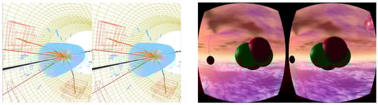 Significant projects in particle physics such as collision experiments at CERN (European Organization for Nuclear Research) with the Large Hadron Collider required advanced visualization methods and were visualized with their own developed framework iSpy WebGL [74]. The researchers aimed to visualize events, detected and reconstructed by experiments at CERN, using Three.js with a client-side application (https://github.com/cms-outreach/ispy-webgl). Besides producing images and animations of the collision events of particles for the public, the authors integrated a stereo view. They applied Virtual Reality with Google’s Cardboard (https://arvr.google.com/cardboard/) but plan the integration of the WebVR API as well in the future (see Figure 9 left).