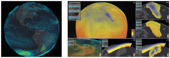 Especially research on climate or meteorological data and their visualization have emerged in the last decades. Researchers have also been more concerned with climate warming, ecological, and environmental issues. PolarGlobe is another example of a web-based platform based on Cesium.js, enabling the three-dimensional visualization of multidimensional, time-varying climate data on a virtual globe [85]. The server takes care of dimension reduction, linear transformation, and video encoding, while the browser restores the data and visualizes it with GPU-based client-rendering via WebGL. The authors used lossy video compression techniques for improving the transmission of a significant amount of time series data over the web and realize real-time data rendering. The user interface with interactive climate visualizations of the Earth is shown in Figure 12.