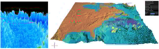 Moreover, some forms of geographical visualizations are concerned with marine or ocean data. Besides many other types of geological visualizations, the previously described web portal GPlates [82] demonstrated the visualization of seafloor plans, as seen in Figure 13. Further tools that primarily focus on web visualization of oceanography can be found in [89,145]. Resch et al. [145] used WebGL for visualizing 4D marine geo-data in a client-server approach. They describe the implementation of time-dependent geo-data. Furthermore, the authors discuss challenges and requirements, especially for implementing spatial-temporal data on the web. Comparatively, EddyViz [89] used Three.js for their software to visualize natural phenomena such as ocean eddies and water circulation in 3D (see Figure 13 left). These visualizations can be helpful for scientists or students in oceanography, meteorology, and environmental sciences.