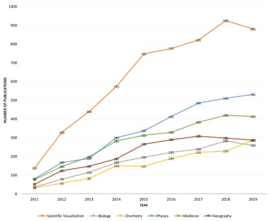 Web visualization in medical sciences can have useful advantages in offering computing resources to hospitals and clinics without much computational power [46]. Moreover, another use case for web-based visualization of medical data is remote medicine and distributed diagnosis [47]. Compared to other scientific disciplines, medical imaging is one of the most challenging and can lead to computing-intensive visualization scenarios due to the need for high-quality images, scalability, and interaction possibilities in visualization tools [5]. Another growing field is the popularity of visualization web tools for medical education of students, especially exploiting graphical 3D web technologies within human anatomy education, see, for example, in [35,95,96,97,98,99]. More on medical education application can be found in Preim and Saalfeld’s review [100]. A real-time surgical training system developed by Mani and Li [31] targeted further educational purposes using WebGL and X3D.