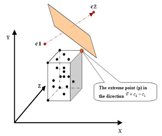 The mechanism of assigning a leaf “L” to a cluster is simple (Figure 2). This mechanism is illustrated in detail in Kanungo et al. 2002. It depends on the extreme point “p” in the direction of the leaf “L” and the two clusters’ centers “c1” and “c2”. By calculating the distance from “p” to “c1” and “c2”, it will be known which of “c1” and “c2” is closer to “L” and whether all the data points in “L” belong to the cluster of center “c1” or “c2”.