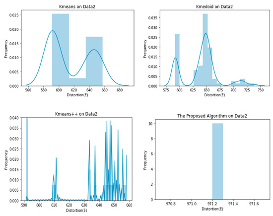 The results of the proposed algorithm were compared to those of the K-means algorithm, K-medoid, and K-means++ (other variants of the K-means algorithm). The clustering criterion “E” (Equation (2)) was used to evaluate the performance of the algorithms. The smaller the value of this metric, the better the clustering results. All algorithms were executed many times (100 times). The average, minimum and maximum values of “E” were noted.