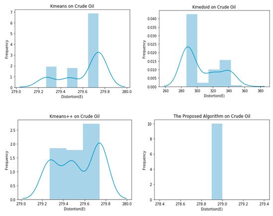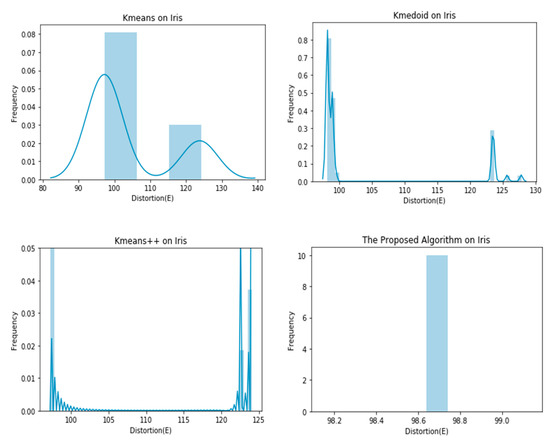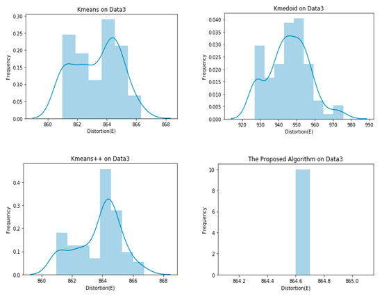 As evident in the results of the experiments, the proposed clustering algorithm gives stable results in all cases and outperforms the K-means, K-medoid, and K-means++ in most cases. It yields a lower value of the distortion “E”, which means better clustering solutions in most cases. The stability of the proposed algorithm can be seen in Figure 4, Figure 5, Figure 6, Figure 7, Figure 8 and Figure 9. The algorithm gives the same value of the distortion in 100 different runs, which means overcoming the problem of instability.