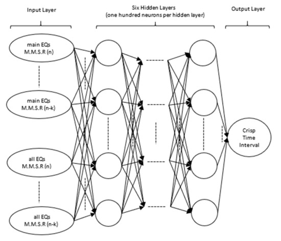 Once the data attributed to the various potentially distinct seismic zones are made readily available via the aforementioned process, it is then possible to investigate for possible correlations between the released amounts of seismic energy and the time intervals between consecutive large earthquakes of a particular potential distinct seismic zone alone. Deep learning neural networks are deployed for that purpose as they are both capable of handling large amounts of data and also perform features’ extraction and classification upon the processed data. With classic neural networks, features’ extraction requires the incorporation of domain experts’ knowledge. In the case of deep learning neural networks this is alleviated providing there is a sufficient number of hidden layers of neurons in the neural network and the data provided are characteristic of the described system [17,18,19]. To ensure that for the particular case of investigating the seismic behavior of the Ionian potentially distinct seismic region, all seismic data recordings from 1964 to 2019 are shown to the deep learning neural network, whose architecture was extended to the maximum possible dimensions supported by the available hardware resources in terms of GPU compute unified device architecture (CUDA) cores and parallel processing threads. The architecture of the deep learning neural network, shown in Figure 2, comprised of one input, six hidden and one output layer. The input layer imports to the deep learning neural network the current and previous mean seismicity rates computed for main earthquakes (main EQs) only, as well as the current and previous mean seismicity rates computed for all earthquakes (all EQs), including foreshocks and aftershocks, hereby infiltrating recursive information to the deep learning neural network. This information is being propagated through a six hidden layer network of a hundred neurons per hidden layer before reaching the single neuron output layer, which produced a crisp output.