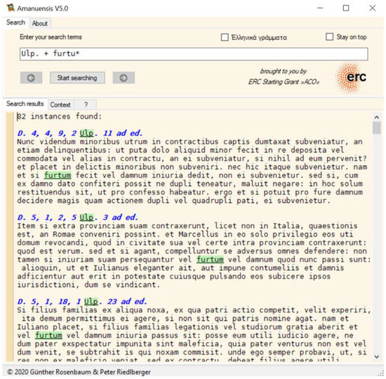 Even before the first volumes of the Index Thomisticus came to light, Marianne Meinhart proposed a similar computational project to study the Latin text of the Digest in 1970. The first results materialised in about 100,000 punch cards based on Mommsen’s text edition and created by a dedicated research institute at the University of Linz five years later. The institute decided to make the expanded and corrected ROMTEXT database available in DOS format which enabled to run search queries in a command line interface [11]. Peter Riedlberger and Günther Rosenbaum provided ROMTEXT with a graphical user interface in the Amanuensis software [30] from which we pulled the raw text of the Digest for our study. Figure 1 is a screenshot from this opensource software. In this example, we search the works of the jurist Ulpian (“Ulp.”) for the inflected forms of furtum (“theft”) with a wildcard (“furtu*”). The screenshot shows how bibliographic headings and text units are arranged in ROMTEXT.