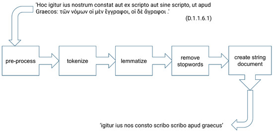 The starting point of our analysis consisted of 21,055 text units organized into 432 thematic sections of the Digest pulled from raw text files (.csv and .txt) based on the database described in Section 2. A series of pre-processing steps were necessary in order to apply clustering algorithms to the text. Figure 2 summarises the steps on the example of a mixed Greek and Latin sentence from Ulpian’s Institutes 1 preserved in D.1.1.6.1. We removed punctuation, superfluous white spaces, and the characters of occasional Greek quotations (non-ASCII). We split the text on white space to create a list of word tokens, and then, we generated the dictionary form (lemma) of each inflected word. For the lemmatization of inflected Latin word tokens, we used the BackoffLatinLemmatizer (BLL) developed by Patrick J. Burns [41] for the Classical Language Toolkit (cltk), a Python-based NLP framework for classical languages inspired by the Natural Language Toolkit (nltk) [42]. Burns’ BLL combines multiple lemmatizer tools in a backoff chain passing the word token to the next tool in the chain until a lemma is returned, or the chain runs out of options. It should be noted that lemmatization was found to be incomplete as the BLL was not able to identify the lemmas of some inflected forms.