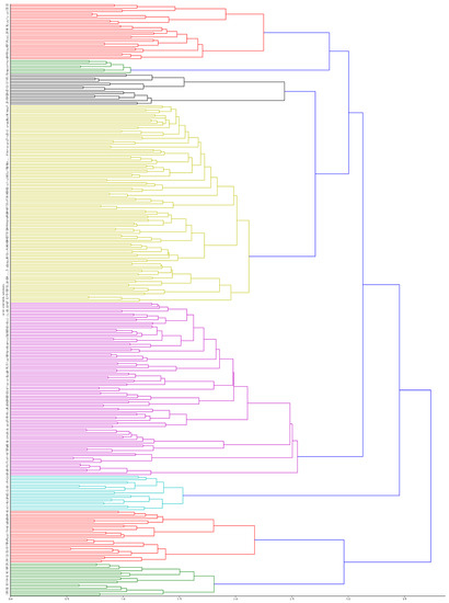 - Sokal, R.R.; Rohlf, F.J. The comparison of dendrograms by objective methods. Taxon 1962, 11, 33–40. [Google Scholar] [CrossRef]