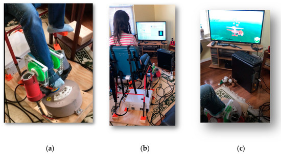 PedBotHome prototype in pilot use in a participant’s home. (a) Child’s foot in the robot-assisted controller; (b) PedBotHome prototype footprint; (c) Flying game interface.