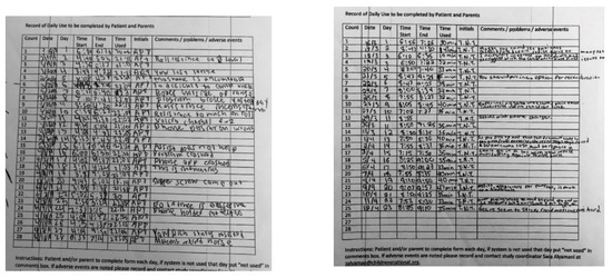 Ambiguous alignment. PedBotHome captures all data to the system so does not incorporate a logbook as is common in manual HEP. In the context of the research pilot, however, families kept a log of their use of theA/R gamebot and made notations about any problems they encountered. Some children found the logging satisfying. See Figure 4 for examples of detailed logbooks some children kept.