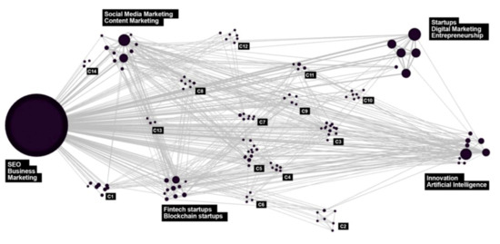 In order to better visualize the results of the processes depicted in Figure 2a–d, Figure 3 shows the UGC communities in terms of the weight of the corresponding nodes. As can be seen in Figure 3, of a total 2145 identified communities, 18 had a greater weight. By order of weight, our results showed that the node/community corresponding to SEO, business and marketing had the weight of 0.05062; startups, digital marketing, and entrepreneurship had the weight of 0.0454. These communities were followed, in the descending order of weight, by innovation and AI (0.0077); Fintech startups and blockchain startups (0.0059); SMM and content marketing (0.0058). Communities from C1 to C14 contained indicators of SEO optimization, tools, and tips related to SEO; these were small user communities focused on the discussion of the best practices and offering SEO advice for startups.