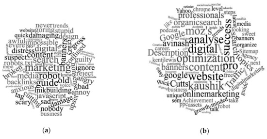As can be observed in Figure 4b, positive issues that should optimize the startups are title, description, URL, AMP, sitemap.xml, long-tail keywords, traffic, and social tags. Furthermore, as shown in Figure 4a, negative issues are robots.txt and tag, JavaScript, backlinks, and link building. There have also been figures of influencers. In addition, influential figures in the SEO sector, such as Rand Fishkin, Avinash Kaushik, Matt Cutts, or Eduardo Garolera, turned out to be positively evaluated in our sample.