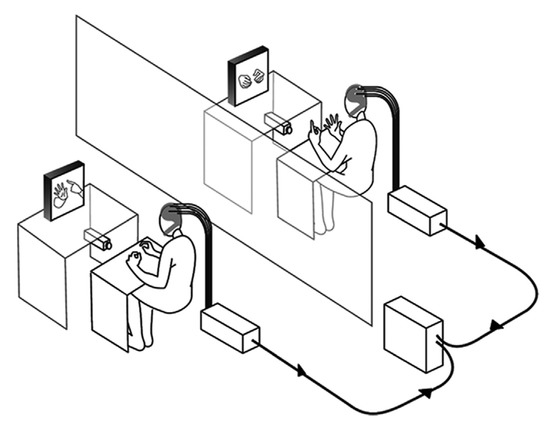 - Imitation tasks: These tasks require one participant to imitate the other’s movement or behaviour. The tasks are designed to assess how movements or behaviours are “taken on board” by the participant, attempting to imitate a given task or behaviour. Results from studies using this paradigm demonstrate that there appears to be a clear correlation of neural activity or inter-brain synchrony between the person performing the task and the one imitating it [34], especially in cases where imitation appears to be “mirrored” [33,34]. Participant pairs that do not perform well on such a task do not appear to exhibit the same level of inter-brain synchrony. Figure 2 shows an imitation task used by Delaherche et al. [34] to study inter-brain synchrony using the hyperscanning method.