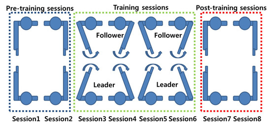 Figure 2. An imitation task, as described by [34]. - Co-ordination tasks: Co-ordination tasks require participants to act in a synchronised manner. These tasks attempt to mimic the behavioural synchronisation that is commonly seen in daily life. For example, the footsteps of two people walking together may unconsciously sync each other up, even though their intrinsic cycles are different [33]. It must be noted that in some of the references listed in this paper, there is little difference between imitation and co-ordination tasks. For example, Yun et al. [33] demonstrated via their experiment that both co-ordination and imitation are intrinsic parts of their experimental design (Figure 3). While only the results from the co-ordination tasks (Sessions 1, 2, 7, and 8) were analysed for inter-brain synchrony, it is the imitation task (training sessions/social interaction) that is said to help induce synchrony between the two brains.