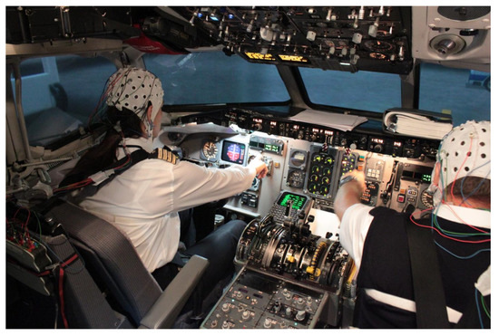 - Ecologically valid/natural scenarios: Of all of the hyperscanning experimental paradigms, this is the most interesting one, as it puts participants into real-world scenarios to study social interaction via neuroimaging techniques. The most commonly used neuroimaging technique employed for these studies appears to be EEG. This is possibly due to the advances in quality, portability, and the relatively low cost of EEG headsets. Additionally, the decreasing costs have allowed for relatively large-scale studies to be conducted while being able to obtain good-quality data, such as that demonstrated by Dikker et al. [37] who captured data from 12 EEG systems. Other researchers have also employed this experimental paradigm in scenarios ranging from card game play [31] and music performance [50] to piloting an aircraft [36], as shown in Figure 5.