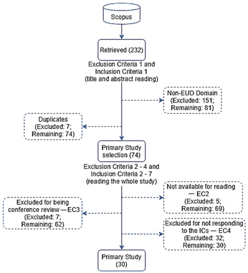 It is important to mention that this search did not distinguish between the terms EUC (end-user computing), EUSE (end-user software engineering), EUP (end-user programming), and EU (end-user). The review included publications on any of these topics, thus adopting the perspective taken by the authors of each paper and generalizing the approaches to define EUD as in Lieberman [3].