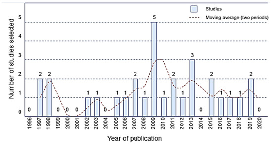 The studies were published between 1996 and 2020 (24-year period). Few studies have been published on the adoption of EUD strategies in organizations, as shown in Figure 3. In general, there are one or two publications per year, with the exception of 2009, when there were five publications and 2013, with three publications. The moving average of the previous two periods, represented by the dashed line, shows a tendency of less than one publication in the following years. There is a small number of studies about EUD in this context.
