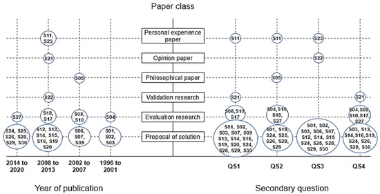 The studies were classified according to the research approaches adapted by Petersen and Feldt [11] and Wieringa et al. [43], which were originally proposed for the field of education in order to record the type of research reported in the primary studies selected—evaluation research; validation research; proposal of solution; experience paper; philosophical paper; and opinion paper. Figure 4 shows that the studies published from 1996 to 2001 were mostly proposals of solution and evaluation research—they presented, respectively, the solution to a given problem based on existing techniques (or the extension of them) and the practical implementation of some techniques, as well as their benefits and disadvantages.