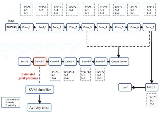 In order to take into account the full-body pose estimation, we modified the already mentioned architecture considering the fact that adding the lower-body joints should improve the pose estimation results as far as the activity recognition rate [], opening up other possibilities for applications. Indeed, the suggested architecture consists of several convolution, pooling, and loss layers. As depicted in Figure 2, the overall network is composed of two levels: (i) fully-convolutional layers and (ii) fusion layers. The input is a set of RGB video frames with a resolution. For each frame, fifteen key joint positions are predicted. The output of the last loss layer () represents the 2D coordinates of the full-body joint positions. Later, those positions will be the input to the SVM classifier in order to recognize the human activity. The first stage of the proposed architecture is fully convolutional: eight convolution layers with a stride equal to 1, where the first two layers are followed by a max-pooling layer with a stride equal to 2. The output of the “conv8” layer is a set of heat maps with a fixed size , where i and j represent the heat map size and k is the number of joints to regress (here, ). In order to learn the dependencies between the locations of human body parts, the convolution layer “conv7”, which shows pre-heat map activations, is concatenated with “conv3”, which represents a skip layer. In fact, training deep networks especially with a small amount of data can lead to many problems, namely vanishing and exploding gradients. In order to deal with this issue, we used a specific layer named the skip connection/layer, where activations are taken from one layer and fed to another one that is deeper in the network. This concatenation represents the input of the second stage of the fusion layers. We should note that the proposed network architecture is based on regressing heat maps for each joint instead of directly regressing the positions of the joints as this is a highly non-linear problem.