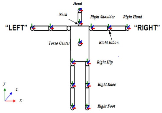 Past work on HPE has been basically founded on hand-crafted features extracted from raw data. At first, the traditional approaches frequently utilized graphical structure models for recovering human poses using image-based observations. Generative approaches (referred to as model-based or top-down) aim to locate different body parts in video frames []. Based essentially on joints and rigid parts, those techniques use a priori information such as motion [] and context []. Thus, an HPE process based on a generative approach is principally composed of two levels: modeling the human body explicitly and then estimating the different joint positions. Depicted as a skeleton, the human body is represented through a collection of parts connected by a set of constraints imposed by different joints (Figure 1).