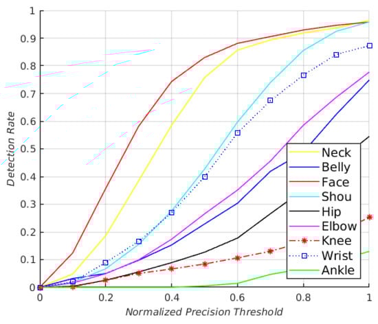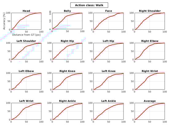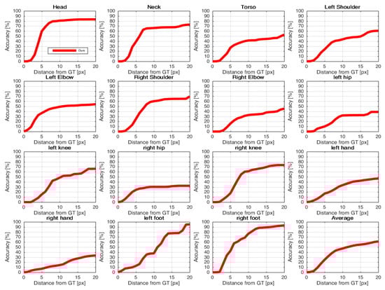 Based on the work of Charles et al. [], a joint is considered to be correctly located if it is within a set distance of d pixels from a marked joint center in the GT. Accordingly, different results are presented as graphs that plot accuracy per joint type vs. distance from the GT in pixels in Figure 4.