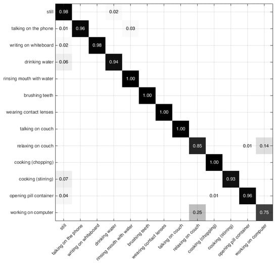 For the upper-body parts of the CAD-60 dataset, the pose estimation results are good enough for different joints. However, for lower-body parts, each iteration seems to be effective for a well-defined part of the human body. For example, in the forth iteration of the cross-validation process, the pose prediction reaches about an 83.1% accuracy rate for “knee”. Despite being a left-handed person in the third iteration (k = 3), the estimation seems to be more effective for “foot”: nearly 100% accuracy. This contrast is due mainly to the joints provided with the CAD-60 dataset. In fact, coming from the Kinect (i.e., not manually calculated), the joints are generally sensitive to noise. In addition, their ability to detect lower parts is almost non-existent, since the distance between the camera and the person must not exceed a few meters. Those facts may explain the different failsobserved especially for lower-body parts. Accuracy results are confirmed with the PCK ones in Table 2, where the scores are reported for each key joint separately and for the whole body. HPE algorithms can be useful for various tasks in many areas, such as action recognition, human detection, human attribute recognition, and various gait processing tasks []. We chose the HAR task as it represents many challenges due to occlusions and overlapping scenes. For such a purpose, a multi-class one-against-one SVM classifier was used through the LIBSVM (Library for Support Vector Machines) [] to recognize different activities. To determine the best configuration of such a classifier, a four-fold cross-validation was applied. As a kernel function, we chose the polynomial one. The SVM input is the vector of the 2D positions of all 15 joints calculated in the previous pose estimation stage. In the training stage, we used 14,294 sample frames of 21,442 and left the rest for the testing stage.
