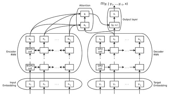 Figure 1 shows the encoder–decoder architecture with an attention mechanism introduced by Bahdanau et al. []. It builds upon the original encoder–decoder model, introduced by Cho et al. [], and based on two RNNs. One RNN encodes a sequence of symbols into a representation vector (encoder RNN, left part of Figure 1), and the other one decodes the representation into another sequence of symbols (decoder RNN, right part of Figure 1). The sequence of symbols can be a phrase, part of a sentence, a sentence, or a longer linguistic unit [].