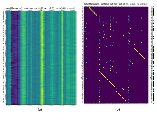 We can also inspect the attention distribution for every time step in the decoding phase. In the attention matrices, every row is the attention distribution that was used to output the token, i.e., the distribution described in Section 2.1. Figure 3a shows the attention matrix generated by ED+A when presented with the input “name[Thesaurus], customer rating[1 out of 5], area[city centre]”. Each row is similar. This means that the context vector (see Equation (1)) is always almost the same: the decoder sees similar input information at every time step. The dark column in the “Thesaurus” word position indicates that the restaurant’s name is the less weighted part of the input, another indication that the ED+A model is just skipping this field’s value. The decoder is prevented from the realization of the “name” field because the context is “unaware” of those data.