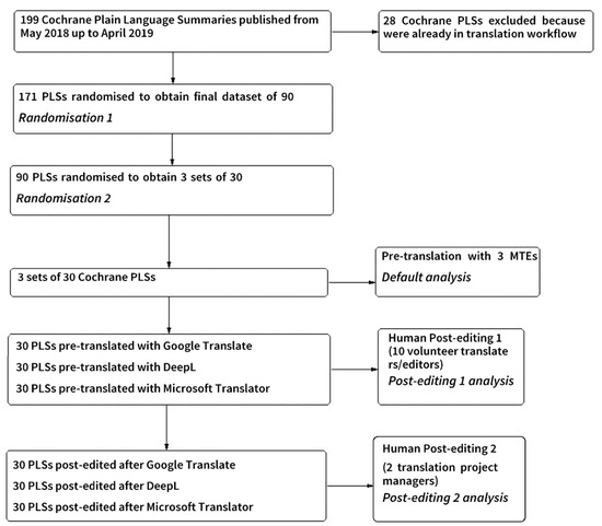 We used 90 PLSs, not 100 as planned in the study protocol, so that we could distribute them evenly across the 3 MTEs. We randomized the 90 PLSs into three sets of 30 PLSs for each of the three MTEs. We pre-translated the PLSs within Memsource with the assigned MTE, as per randomization, to obtain 30 PLSs translated by DeepL, 30 by Google Translate and 30 by Microsoft Translator, respectively.