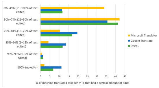 Google Translate had the highest average percentage of text in the 100% and 85–94% ranges; it also had the lowest average percentage of text the 50–74% and 0–49% ranges. According to our interpretation of the ranges of edits, this means that Google Translate is perhaps the best among the three compared MTEs.