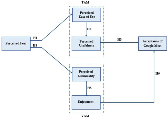 Even though previous studies have focused on technology adoption or acceptance during the spread of COVID-19 within the educational sector, it seems that there is no sufficient evidence to the impact of this technology towards teachers’ and students’ acceptance especially in the usage of Google Meet as a communicational and teaching platform and its effectiveness in the educational sector. Furthermore, the perceived fear factor as a dominant factor has not been investigated in a hybrid model. Based on the discussion above, it was found that the effect of perceived fear and its relation with TAM and VAM models within the educational sector has not been explored before especially within the Arab university students. Accordingly, this paper is an attempt to fill this gap and enhance teachers and educators to the more effective teaching technology during the spread of the pandemic. The reason behind adopting the hybrid model is that every model has its own constructs that will add to the acceptance of Google Meet as an online platform in an educational environment. The value-based adoption model of technology (VAM) is significantly important in examining the effect of Mobile learning technology. Mobile learning is any form of education that is meant to deal with handheld devices including smartphones and i-pads, etc. [13]. One of the interesting factors of mobile learning is its mobility, which adds the factor of flexibility in time, speed, and space [14,15]. Most Arab students are using mobile phones when they use Google Meet in every classes.