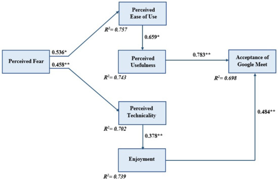 Within the TAM model, the research results are in agreement with the literature concerning the effectiveness of TAM variables [38,74,75]. It has been shown that students’ intention to accept technology during the pandemic is higher when the online platform provides good facilities to improve the educational process. Likewise, Google as an online platform, has been highly evaluated as useful due to the fact that it is easy to use. Similarly, studies by [20,27] are consistent with the results that are found in the current study regarding PU and PEOU since PU and PEOU have positively affected the acceptance of Google Meet and helped in forming a conceptual framework to the students’ reaction of fear during the spread of Coronavirus.
