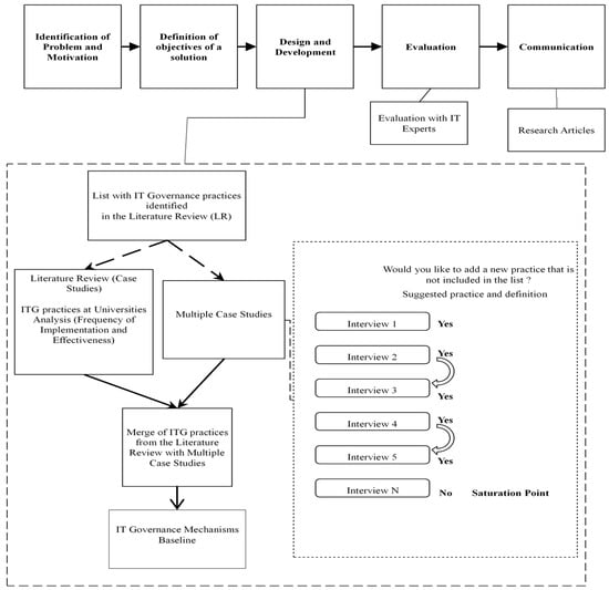 The aim of this research is to develop a baseline model of ITG practices for universities. A suitable research methodology for the creation of an artefact is Design Science Research (DSR). The key elements of DSR on investigations into information systems are the possibility of new fields of research, conduction of tests and validation of theories, or the building of new theories. The purpose of this work is to develop a model and solve a specific problem; in this case, ITG in universities. Therefore, DSR, extensively used in information systems research to solve complex problems [61,62,63,64], can be a suitable approach for this study.