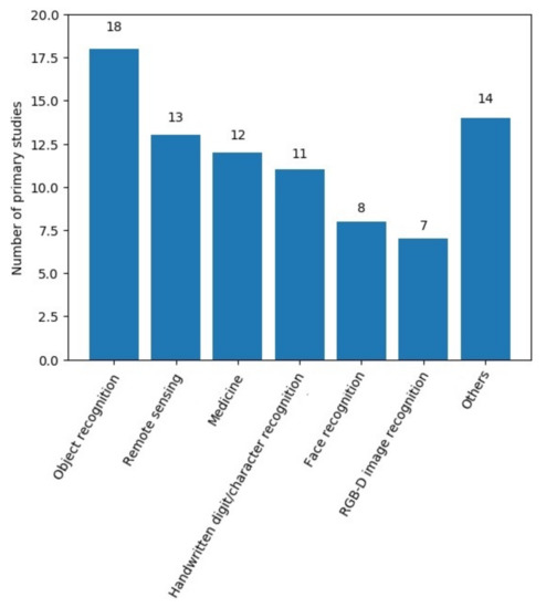 We found 19 different scenarios from the primary studies, but most of them contained four or fewer related studies. Thus, we highlight the six main application scenarios, and the others are demarcated in a single group (Others), as shown in Figure 3. The six main CELM application scenarios that were found among the primary studies were object recognition, remote sensing, medicine, handwritten digit recognition, RGB-D image recognition, and face recognition, totaling 69 articles, or about 83% of the total primary studies.