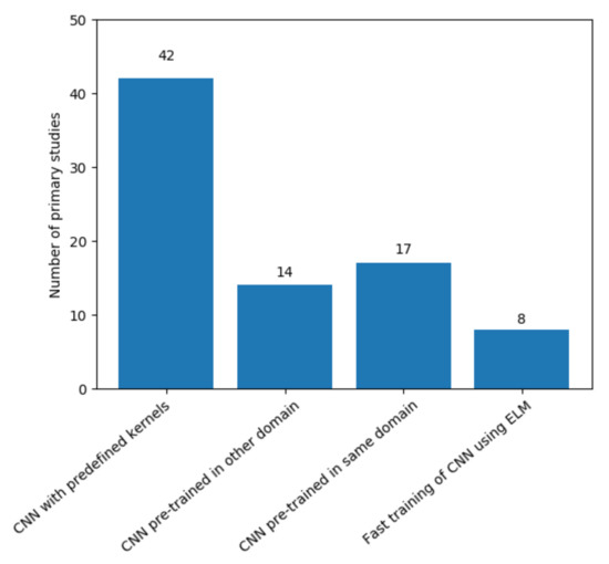 Regarding the primary studies identified, Figure 2 illustrates the percentage of publications of these studies per year. Although we established a time range between 2010 to 2020, articles on the CELM began to be published in 2015. A probable explanation for this is that the first consolidation of DL in the literature and multimedia applications, in general, was in this year. During this consolidation, several alternatives to conventional CNNs were proposed, such as a CNN with many layers [18], residual CNN networks [19], networks with batch normalization [20], dropout [21], and other advances [22]. Besides, researchers aimed to find alternatives with a better generalization capacity and better training and classification time when CELM variations were proposed. The next sections present the analysis and discussion of each research question proposed in this systematic review.