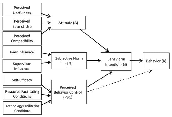 As shown in Figure 1, the three primary concepts (i.e., attitude subjective norm, and perceived behavioral control) directly influence behavioral intentions, and can be decomposed into seven dimensional constructs (i.e., perceived usefulness, perceived ease of use, compatibility, peer influence, supervisory influence, self-efficacy, facilitating conditions). Accordingly, the following hypotheses were proposed: