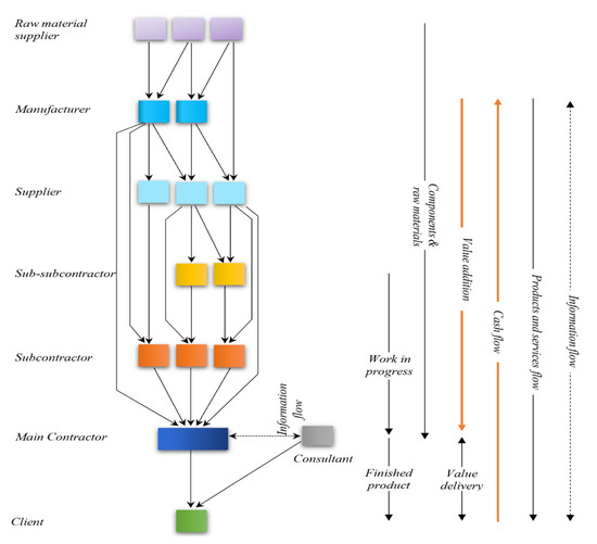 The construction industry has a project-based production process, usually scattered across different geographical locations, and produces some of the most complex and extensive objects [20]. Many specialists, labour, machinery, components, sub-elements, and material should be coordinated on a construction project [1,21]. The nature of construction production gives rise to dynamic, long supply chains. These complex supply chains cause significant uncertainties and issues in the construction industry, especially related to finance and payments [3]. Every project can be considered as a new supply chain, due to a significant number of new outcomes, manufacturers, suppliers, subcontractors, sub-subcontractors, and others, in a fresh geographical location [22]. Typically, the construction industry has lengthy, network-structured, dynamic supply chains rather than short, vertical supply chains [23]. Figure 1 illustrates a basic supply chain network in the construction industry, including the flow of information, cash, components and raw materials, and products and services. As illustrated in Figure 1, the most significant difference of a construction supply chain compared with a manufacturing supply chain is that a construction supply chain has lengthy value addition processes from top to bottom, and the funding predominantly originates from the bottom of the supply chain. Therefore, lengthy, network-structured, and dynamic construction supply chains cause many issues, including payment issues [4].
