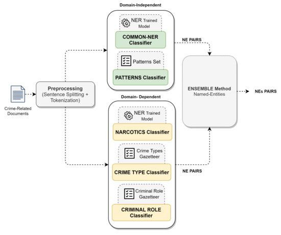 - an NER module was used to identify and classify the NEs relevant to the domain. In this phase, we have proposed classifiers that identify NEs related to the domain;