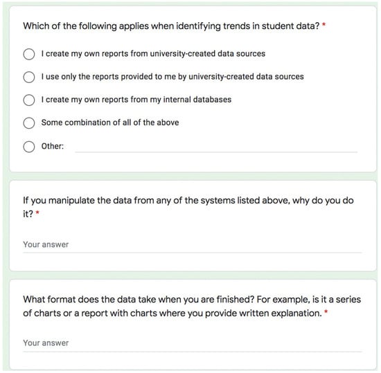 A survey was distributed to database end users. Participants included end users at five midwestern colleges and universities. The participants were briefed about the nature of the study using a recruitment email. Before beginning the survey, the participants read and agreed to an informed consent document. Participants then completed an online Google Forms survey (see Figure 3) that included questions about the participants’ use of databases at their respective institutions, data analysis and reporting, and the convenience of the data source, as well as demographic questions. At the end of the survey, participants were asked if they were willing to participate in a follow-up interview.