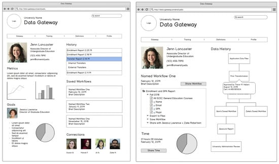 A shared vocabulary was considered an essential foundation for all who access data. As higher education integrates more data technologies, working to predict potential student behavior [], it is necessary to build in roadblocks now so that all users are acquainted with the university’s standard of data acquisition and reporting. As the demands for data continue to grow, it is essential that users have a sense of standardized procedures built into the expectations for their work practices. While roadblocks are often negatively viewed in user experience design, taking away from a seamless experience [], these sorts of roadblocks could ensure that users are all following a standardized method of acquiring and interpreting data that has been laid out and approved by database administrators and university decision makers. We propose building into the gateway a feed of recent activity on the landing page. Within this feed, the system will send notifications to users based on recent history with suggestions for better ways of pulling data or quicker ways to find data. Additionally, database administrators can provide a “most used” feature that will either point to or provide access to the most used data requested by users and units.